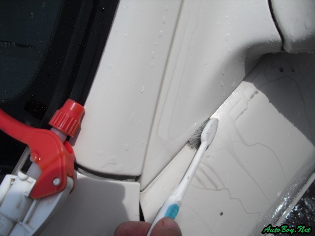 コンパウンドを歯ブラシに取り、マドサッシや廻り、ウインカー廻り、ドアミラー、ドアノブ廻り、エンブレムなど、凹凸がある部分を中心に、磨いていきます。ただし、1箇所を磨いたらすぐにふき取りましょう。放置しておくと固まってしまいます。